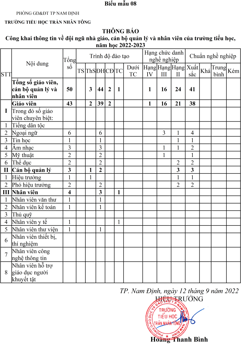 TNT -Công khai Chất lượng giáo dục của trường Tiểu học Trần Nhân Tông năm học 2022-2023 (có bổ sung)