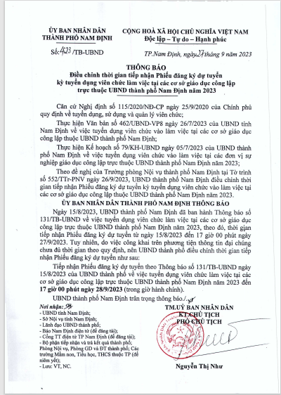 TNT – Công khai Thông báo điều chỉnh thời gian tiếp nhận Phiếu đăng ký dự tuyển kỳ tuyển dụng viên chức làm việc tại các cơ sơ giáo dục công lập trực thuộc UBND TP Nam Định năm 2023