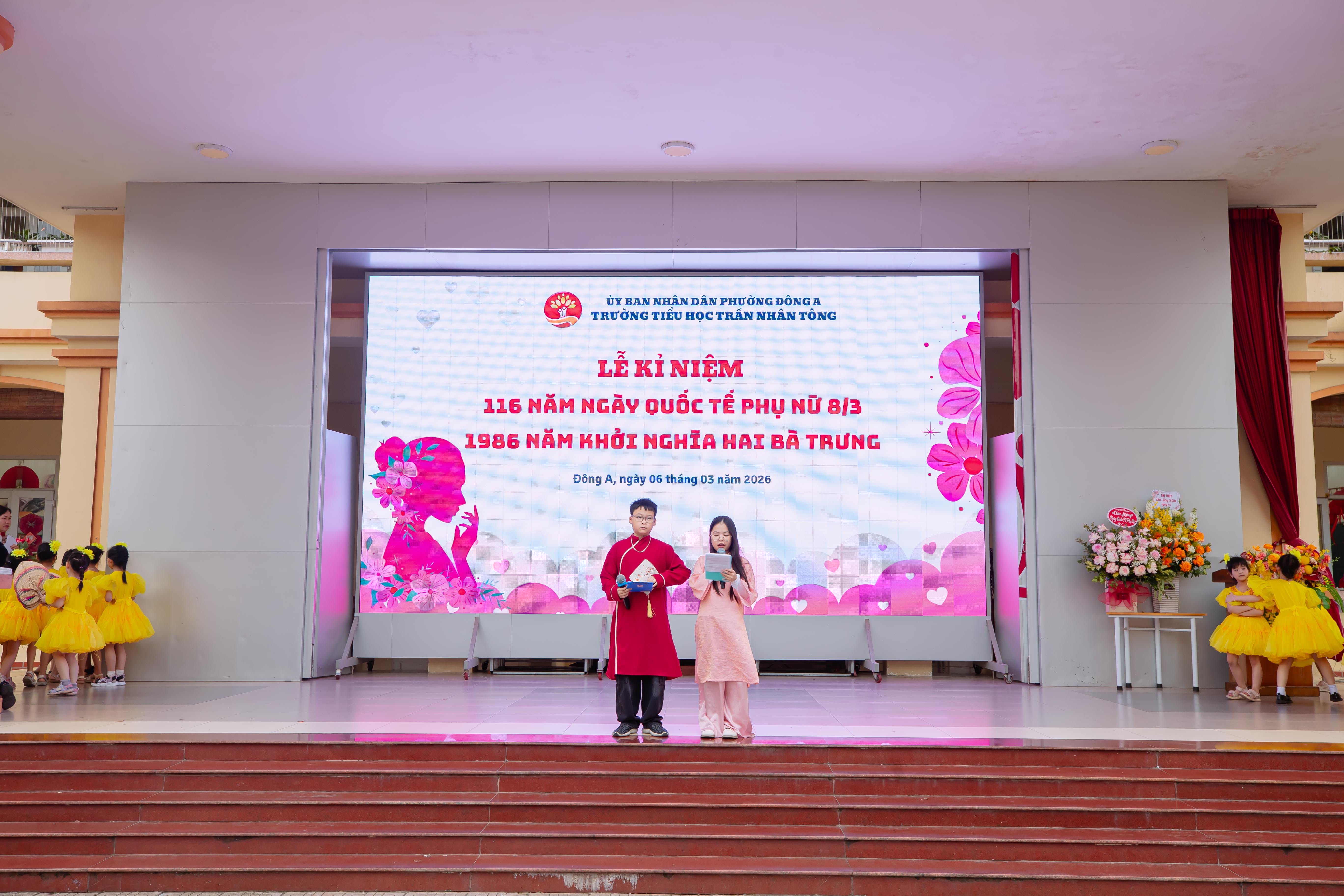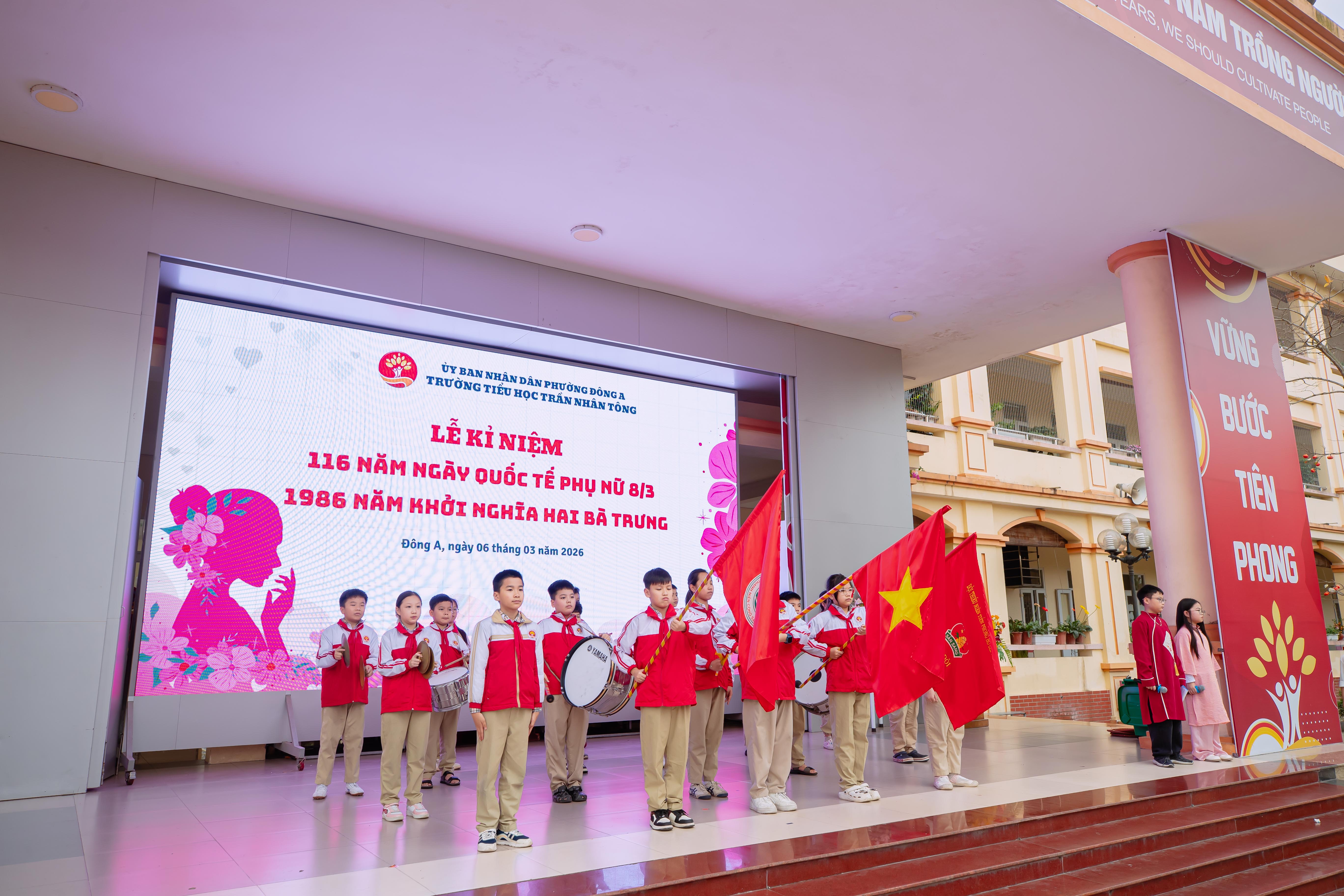 Chiều ngày 06/3/2026, sân Trường Tiểu học Trần Nhân Tông ngập tràn sắc màu và niềm vui khi thầy và trò nhà trường cùng tổ chức các hoạt động kỷ niệm 116 năm Ngày Quốc tế Phụ nữ (8/3/1910 – 8/3/2026) và 1986 năm Khởi nghĩa Hai Bà Trưng.
